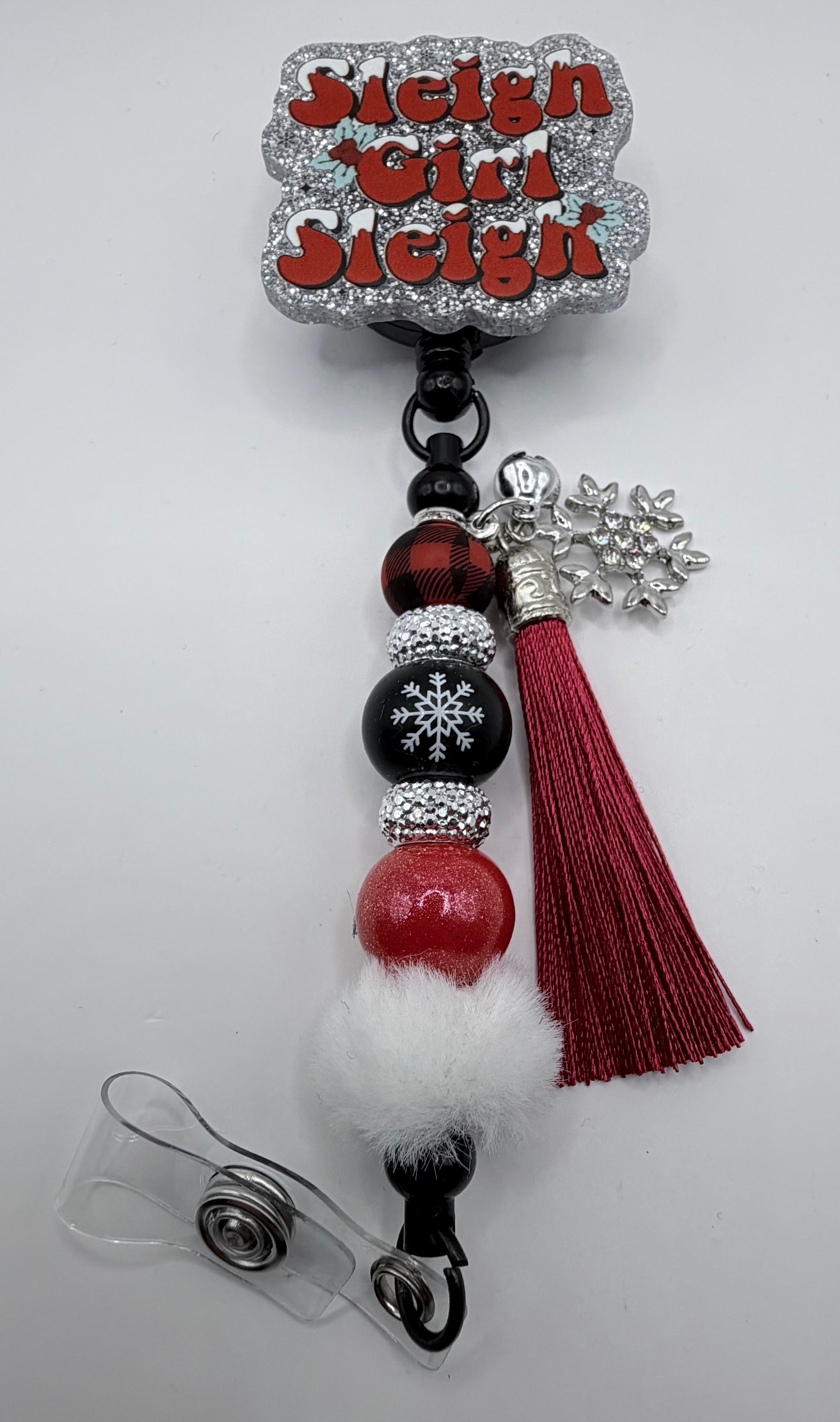"Get your sleigh game on with our Sleigh Girl Badge Reel! Featuring a festive design and secure clip, it's the perfect accessory for spreading holiday cheer and staying motivated at work. Sleigh all day with this fun and functional badge reel. Sleigh, queen!"